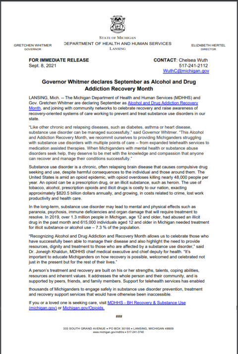 Gov. Gretchen Whitmer designates September Alcohol and Drug Addiction Recovery Month